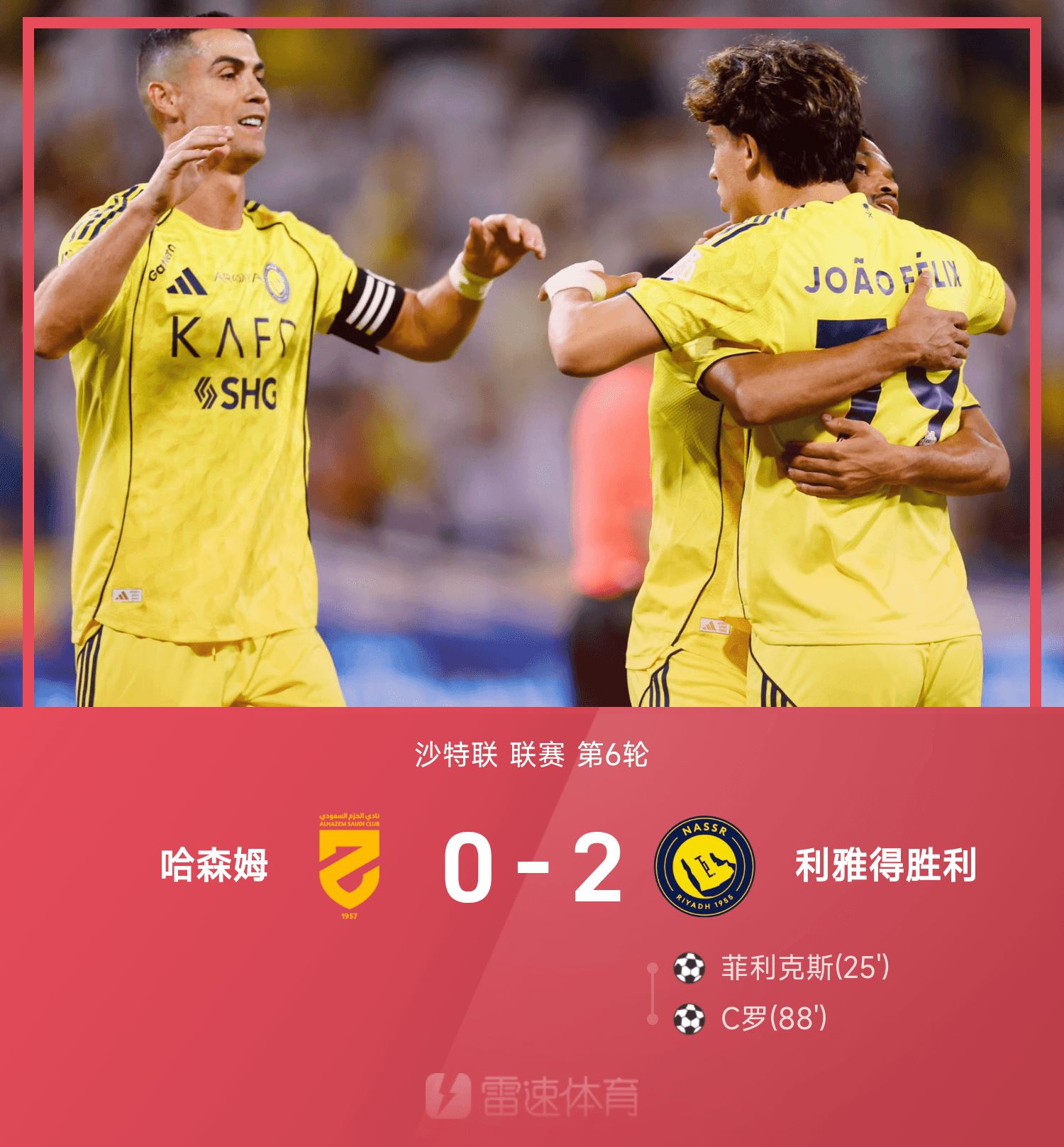 6686 Sports, le 26 octobre, au sixième tour de la Ligue saoudienne 25/26, Riyad a battu Hachem 2-0. En première mi-temps, Félix a dirigé le ballon pour sortir de l'impasse. Avant la fin de la seconde période, le tir lobé de Ronaldo a scellé la victoire. Au final, Riyad a battu l'équipe à l'extérieur 2-0 contre Hachem et a remporté 6 matches de championnat consécutifs.