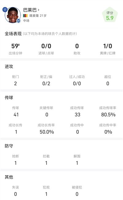 Statistiques de Baleba contre Manchester United : 59 minutes dans le match d'ouverture, taux de réussite de passes et de réceptions 80,5%