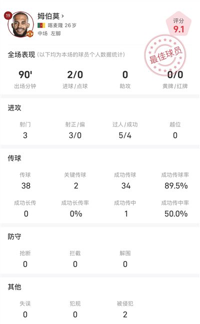 38 passes et 34 passes, 2 passes clés et un taux de réussite de 89,5%;