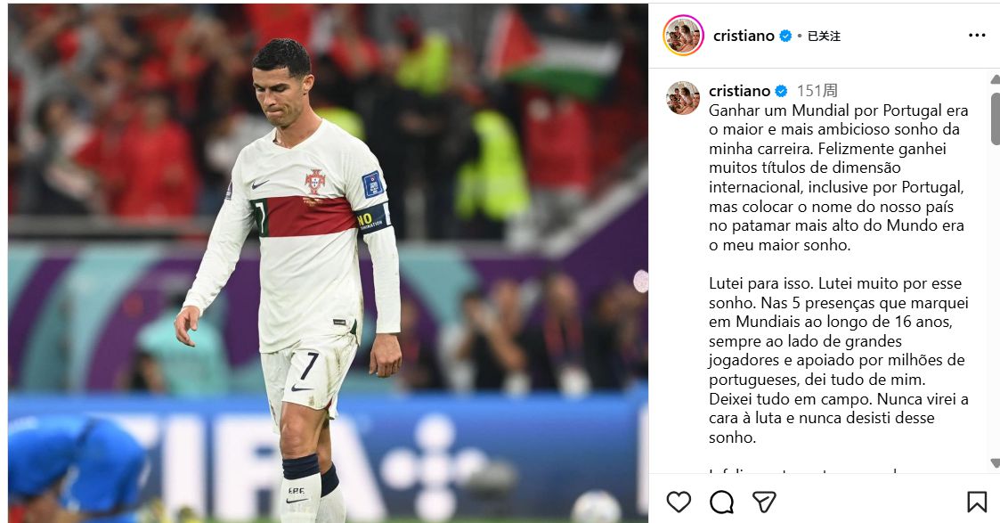 Cependant, le point de vue de Ronaldo après la Coupe du monde au Qatar 2022 est très différent de celui d'aujourd'hui. Après la défaite bouleversante du Portugal contre le Maroc, Ronaldo a publié sur les réseaux sociaux que remporter la Coupe du monde pour le Portugal était le plus grand rêve de sa carrière, et il n'a jamais abandonné ce rêve.