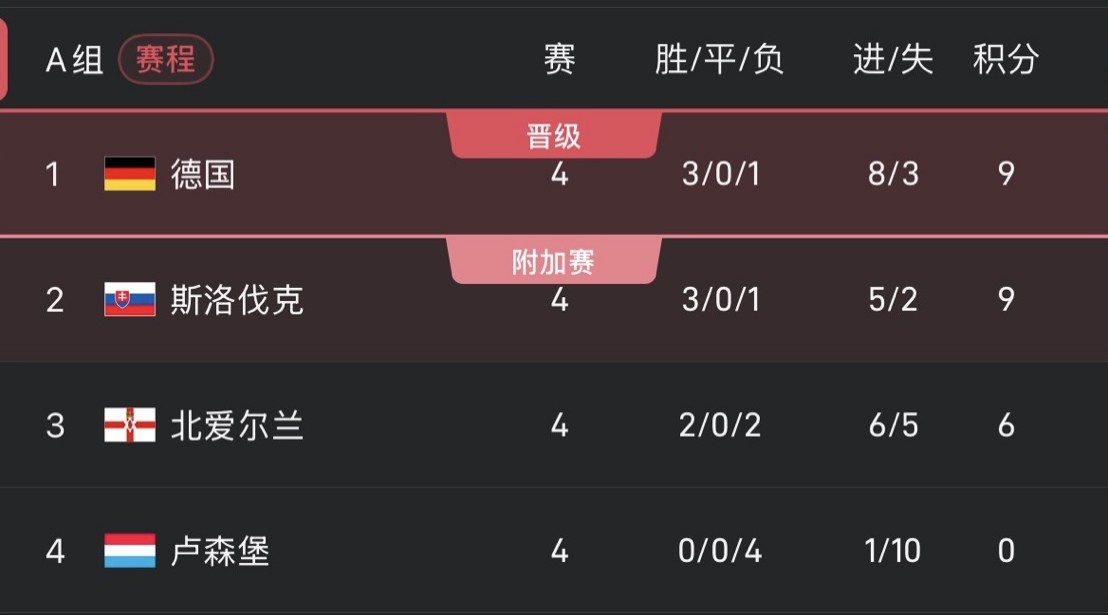 L'Allemagne et la Slovaquie partagent 9 points et elles auront une conversation directe lors du tour final. Avant cela, les deux équipes doivent encore affronter respectivement le Luxembourg et l'Irlande du Nord.