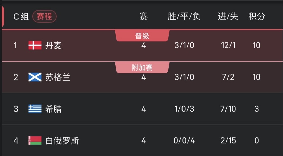 Le Danemark et l'Écosse ont les mêmes points. Les deux équipes s'affronteront directement à Glasgow lors du tour final pour se disputer la première place du groupe.
