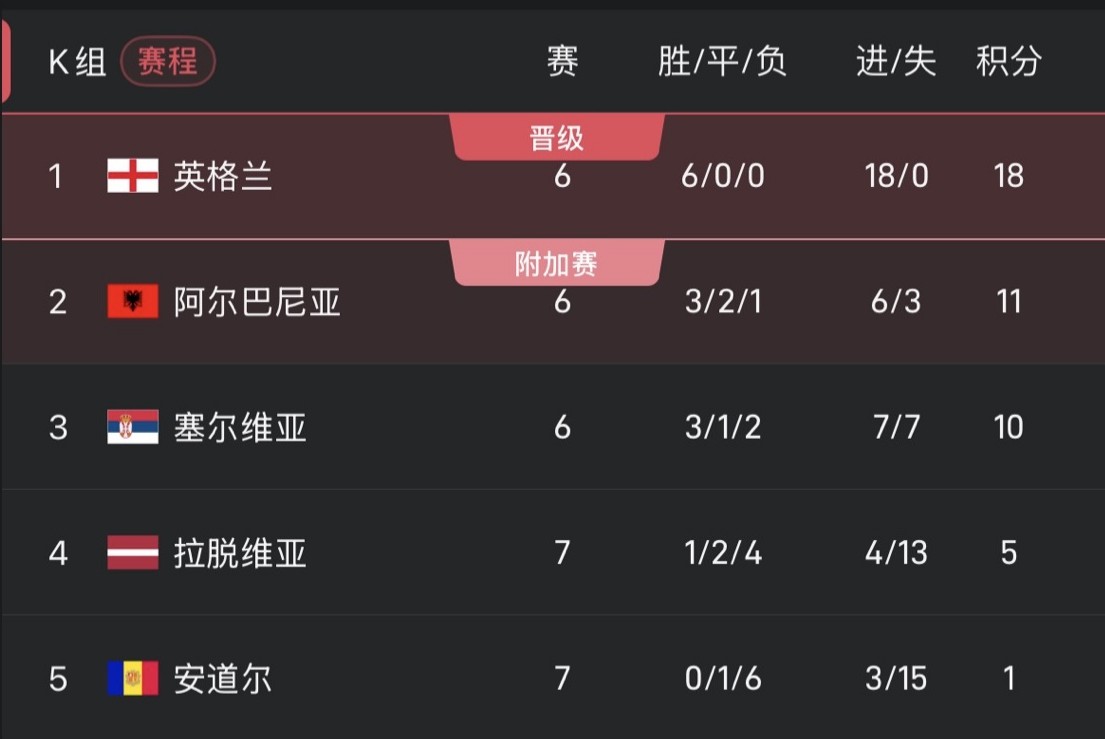 L'Angleterre s'est assuré à l'avance la première place du groupe. L'Albanie et la Serbie se disputeront la deuxième place du groupe.