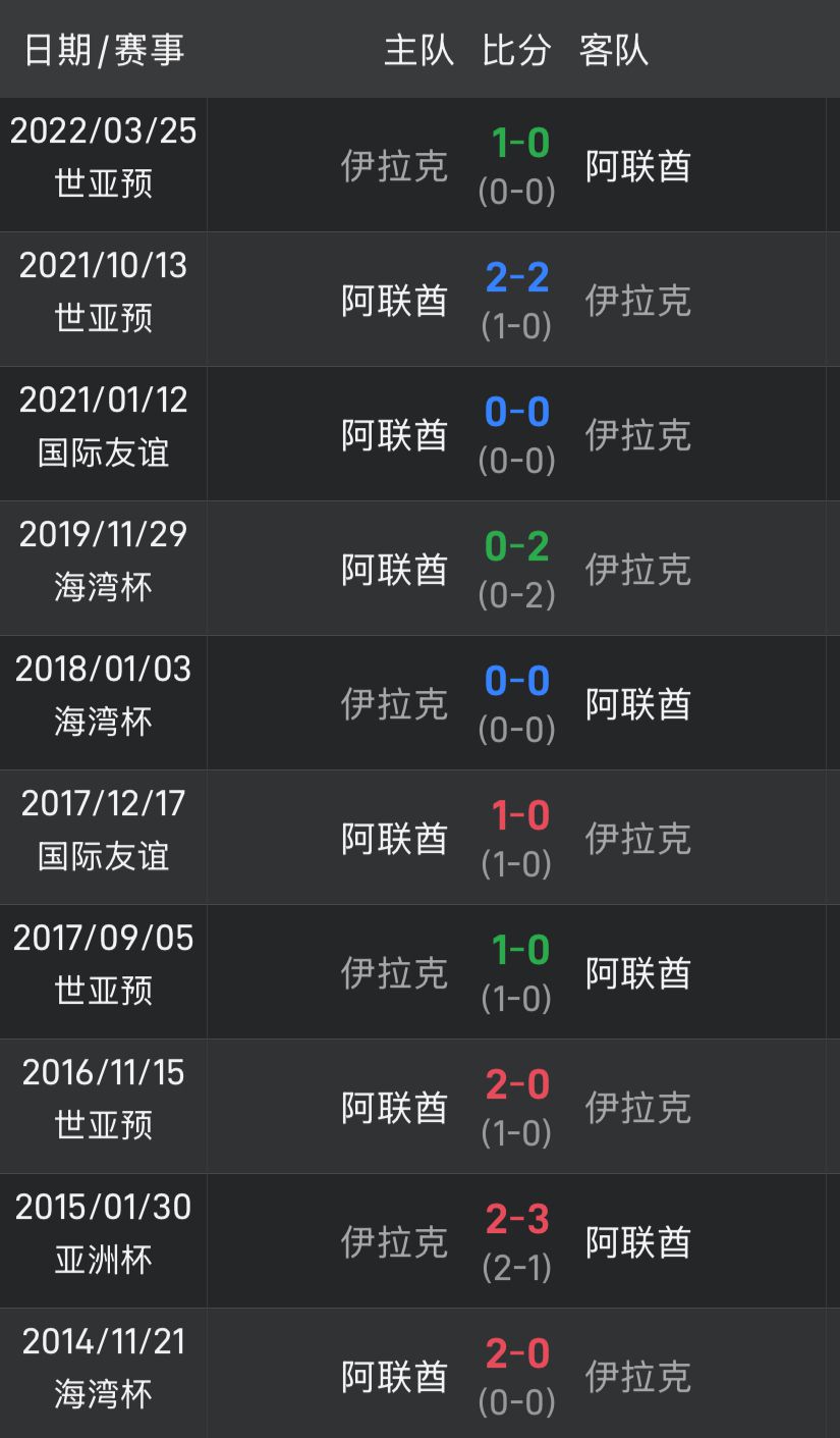 Les données montrent que les Émirats arabes unis ont joué contre l'Irak au cours des 10 dernières fois, avec un bilan de 4 victoires, 3 nuls et 3 défaites, marquant 10 buts et encaissant 8 buts. Bien qu'il semble que les Émirats arabes unis aient un léger avantage, au cours des 5 derniers matchs entre les deux équipes, les Émirats arabes unis ont enregistré 3 nuls et 2 défaites et ont perdu 4 fois.