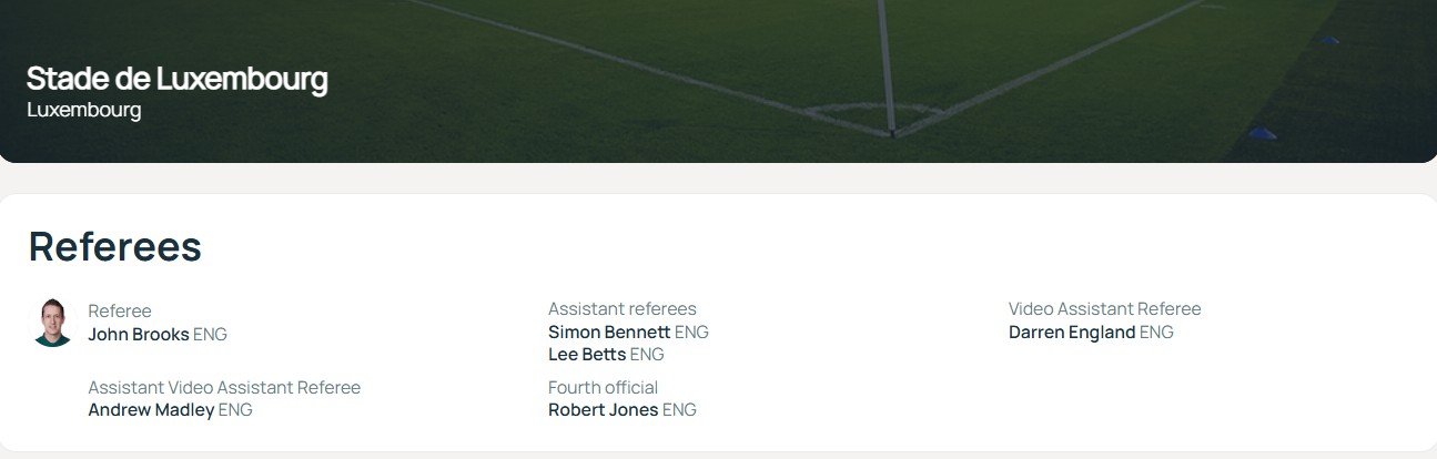Selon les responsables de l'UEFA, ce match sera arbitré par une équipe d'arbitres de la Premier League. L'arbitre en chef est John Brooks et l'arbitre vidéo est Darren England.