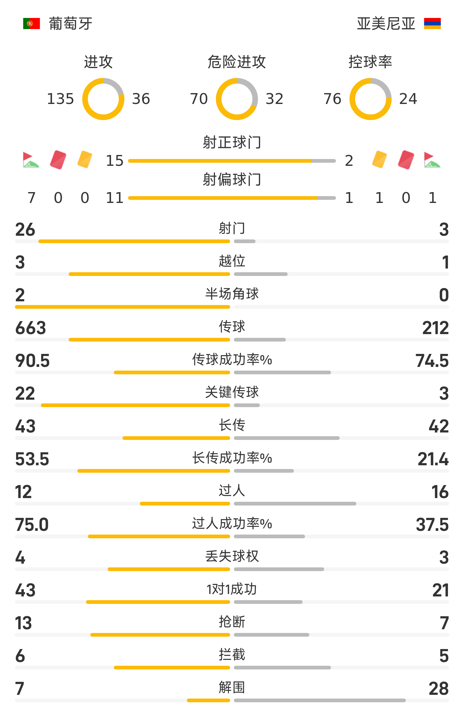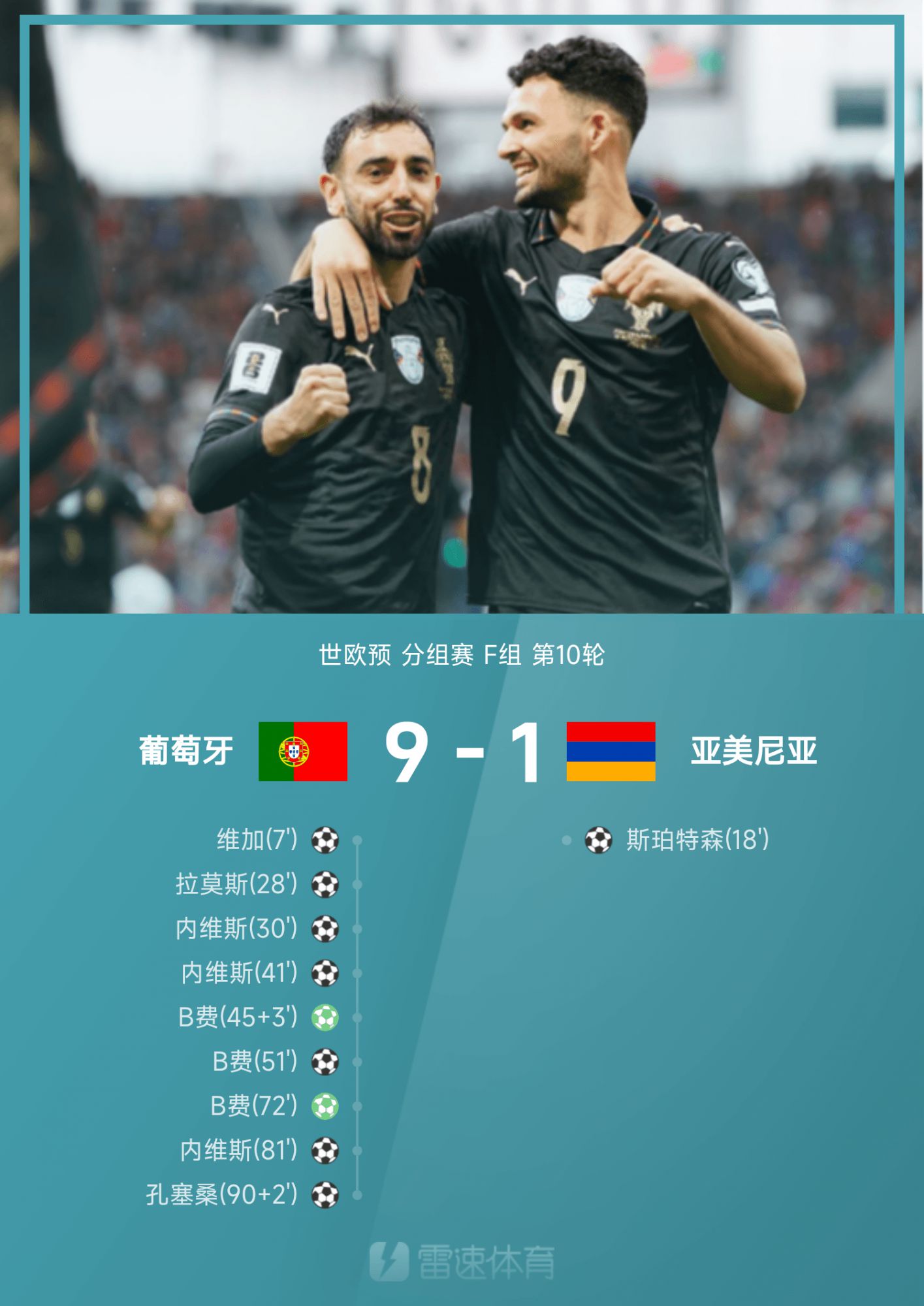 6686 Sports a rapporté le 16 novembre qu'au 10e tour du groupe F des éliminatoires mondiaux européens 2026, l'équipe portugaise locale avait battu l'Arménie 9-1. Vega a fait un blitz pour le Portugal, puis Spertson a égalisé le score pour l'Arménie ; Lors du match suivant, l'équipe portugaise a été comme un dieu d'aide, Neves et B Fee ont réalisé des tours du chapeau l'un après l'autre, Ramos a envoyé une passe et un tir, et Conceição a ajouté la cerise sur le gâteau pour l'équipe. Le Portugal a terminé premier du groupe F avec 13 points avec 4 victoires, 1 nul et 1 défaite, et s'est directement qualifié pour la Coupe du monde 2026 aux États-Unis, au Canada et au Mexique.