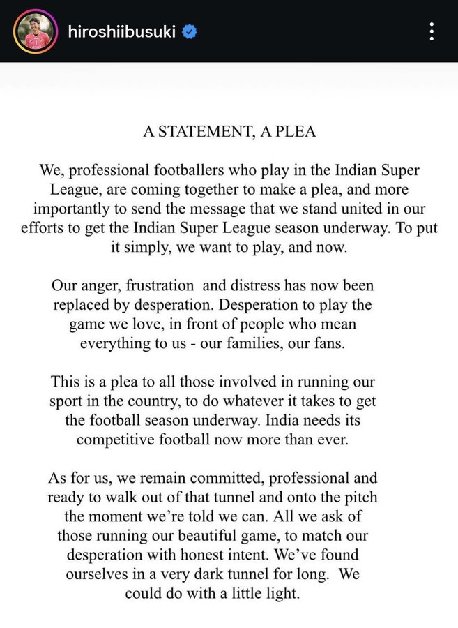 L'attaquant japonais Hiroshi Ibusuki, ancien joueur de la Ligue de l'Ouest et évoluant actuellement pour le Bengale oriental, a écrit avec colère contre la ligue: "Nous sommes un groupe de joueurs de football professionnels qui participent à la Super League indienne. Aujourd'hui, nous avons publié conjointement cette déclaration et lancé un appel: nous espérons que la ligue redémarrera le plus tôt possible. En une phrase: nous voulons jouer au football et nous voulons jouer maintenant."