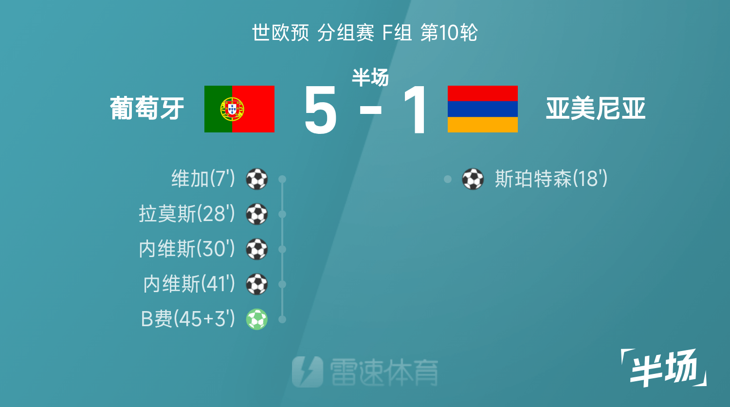 Mi-temps des éliminatoires européennes : double tir de Neves, tir B, Portugal 5-1 Arménie