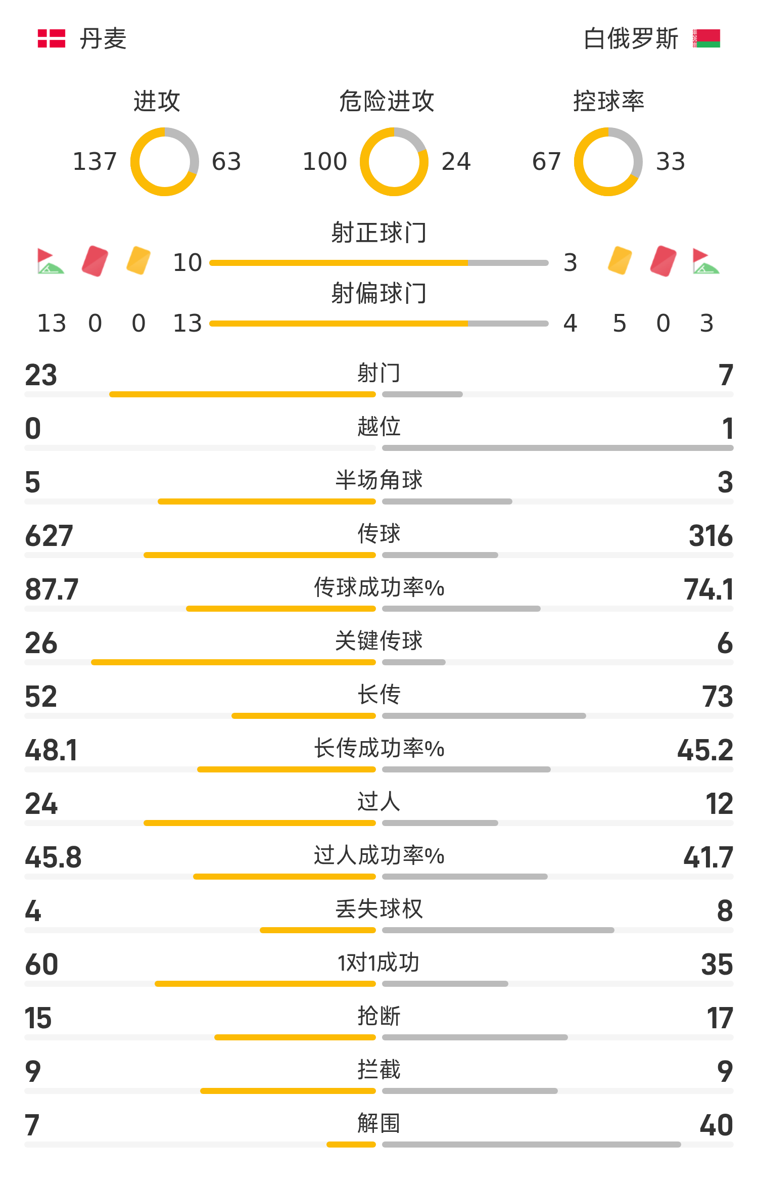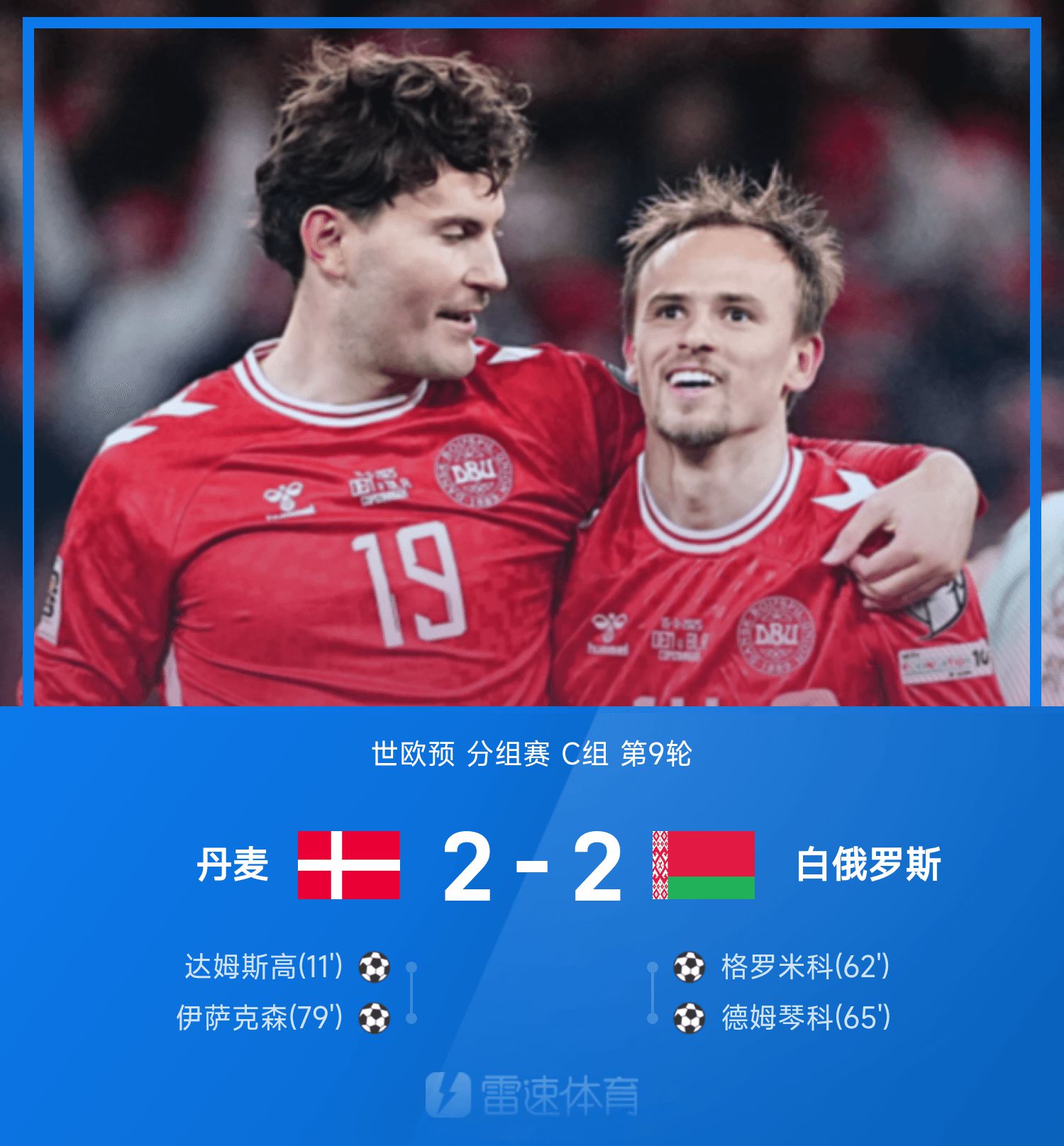 6686 Sports a rapporté le 16 novembre qu'au 9e tour du groupe C des 26e éliminatoires mondiaux européens, le Danemark affrontait la Biélorussie. À la 11e minute, Damsko a frappé une super vague mondiale en dehors de la zone des trois secondes et le Danemark a pris un départ de rêve. La situation a soudainement changé en seconde période. La Biélorussie a utilisé la passe et le tir de Gromyko aux 62e et 65e minutes et a instantanément renversé le score à 2-1. À la 79e minute, Dorgu a passé le ballon dans la surface de réparation et Isaacson a marqué d'un tir explosif. Les deux équipes sont revenues sur la même ligne de départ. Au final, le Danemark a fait match nul 2-2 contre la Biélorussie à domicile. Depuis que l'Écosse dans le même groupe a perdu contre la Grèce lors d'un match à l'extérieur, le Danemark occupait toujours la position avantageuse de se qualifier directement pour la finale de la Coupe du monde.