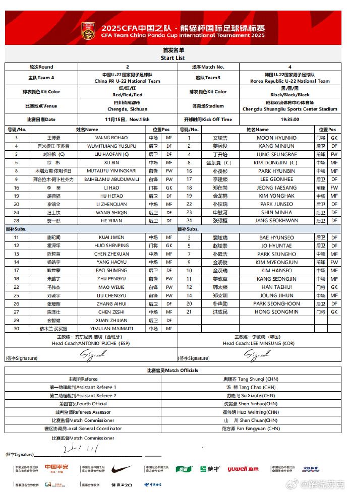 6686 Sports News le 15 novembre, heure de Pékin aujourd'hui, au deuxième tour de la Panda Cup, l'équipe nationale de football U22 a affronté la Corée du Sud U22. Avant le match, les deux équipes ont annoncé la composition de départ.