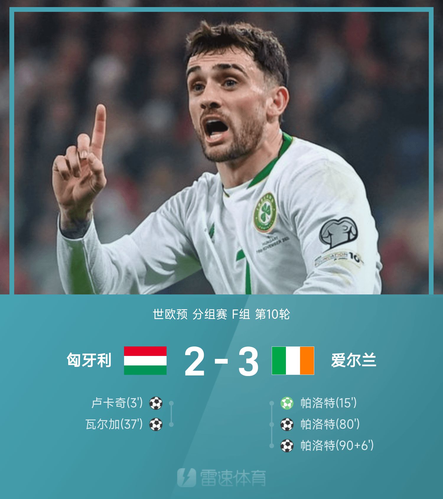 6686 Sports News le 17 novembre Au 10e tour du groupe F des éliminatoires mondiaux européens 2026, l'Irlande a battu la Hongrie 3-2. Peu de temps après le début du match, Lukacs a marqué avec un blitz, puis Parrott a marqué un but, et la vague mondiale de Varga a de nouveau inversé le score du match. À la fin de la seconde mi-temps, Parrott a marqué d'un lob et a marqué le dernier tir dans les arrêts de jeu. L'Irlande a renversé la Hongrie et s'est qualifiée pour les barrages.