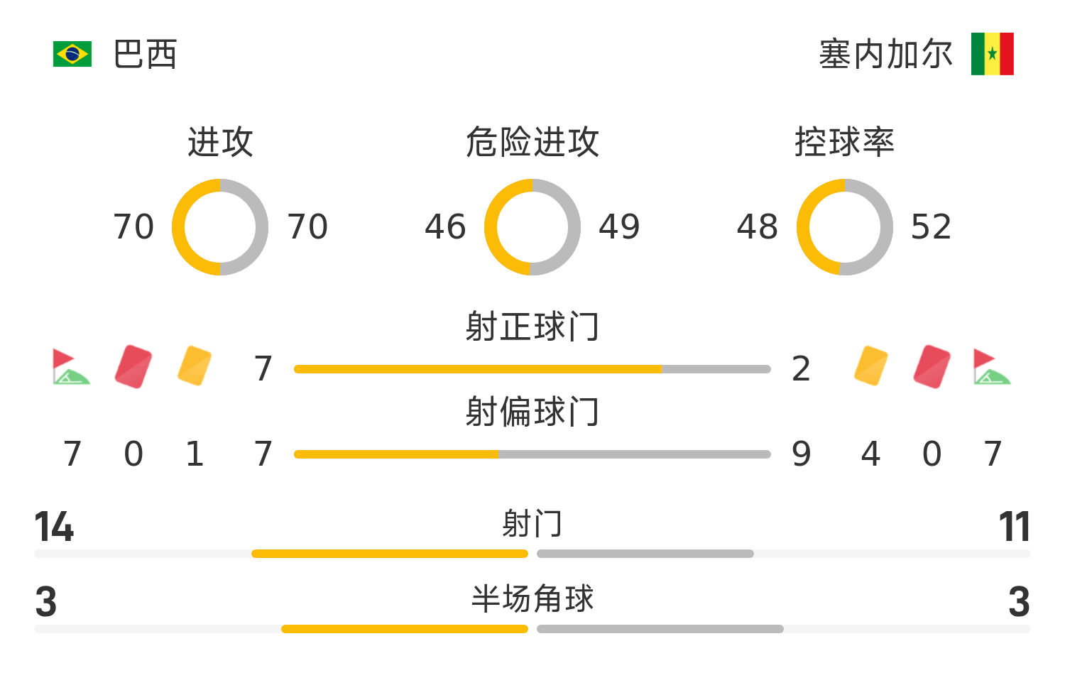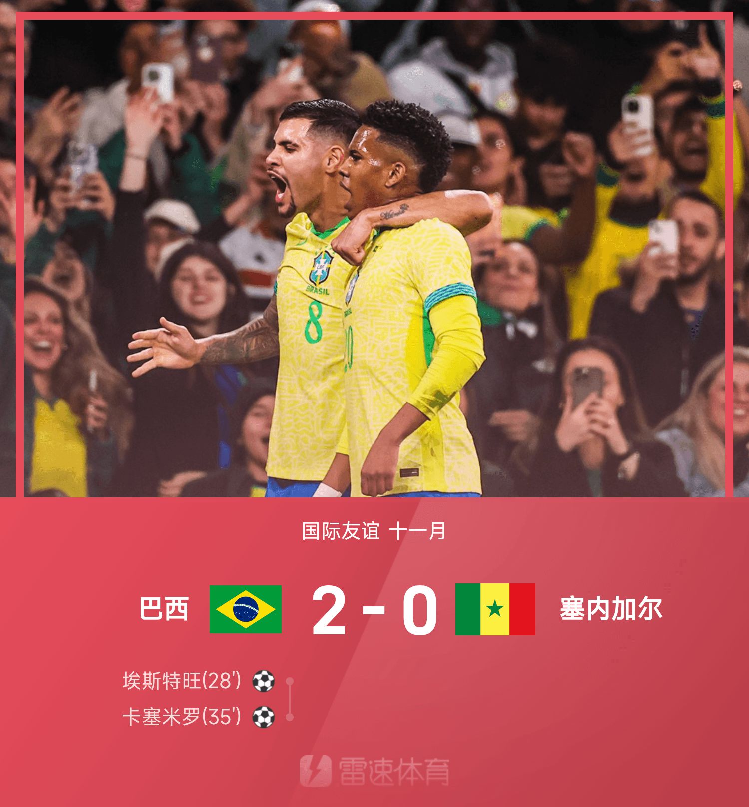 6686 Sports 16 novembre Lors de la 25e saison d'amitié internationale en novembre, le Brésil a battu le Sénégal 2-0. Dans la première moitié du match, Esteban a frappé fort le but depuis la droite et Casemiro a profité de la mauvaise opportunité de son adversaire pour marquer. En seconde période, aucune des deux équipes n'a réalisé de exploit et Gabriel a quitté le terrain blessé.