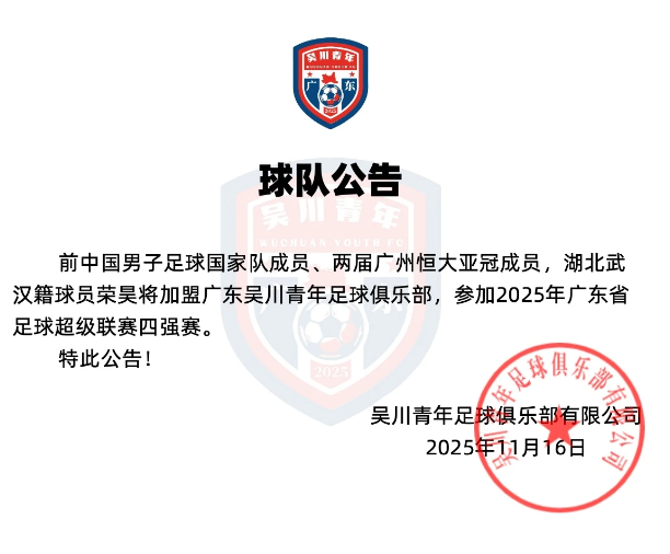 Rong Hao, ancien membre de l'équipe nationale chinoise de football masculin et deux fois membre de la Guangzhou Evergrande AFC Champions League, un joueur de Wuhan, Hubei, rejoindra le Guangdong Wuchuan Youth Football Club et participera aux demi-finales de la Super League provinciale de football du Guangdong 2025.