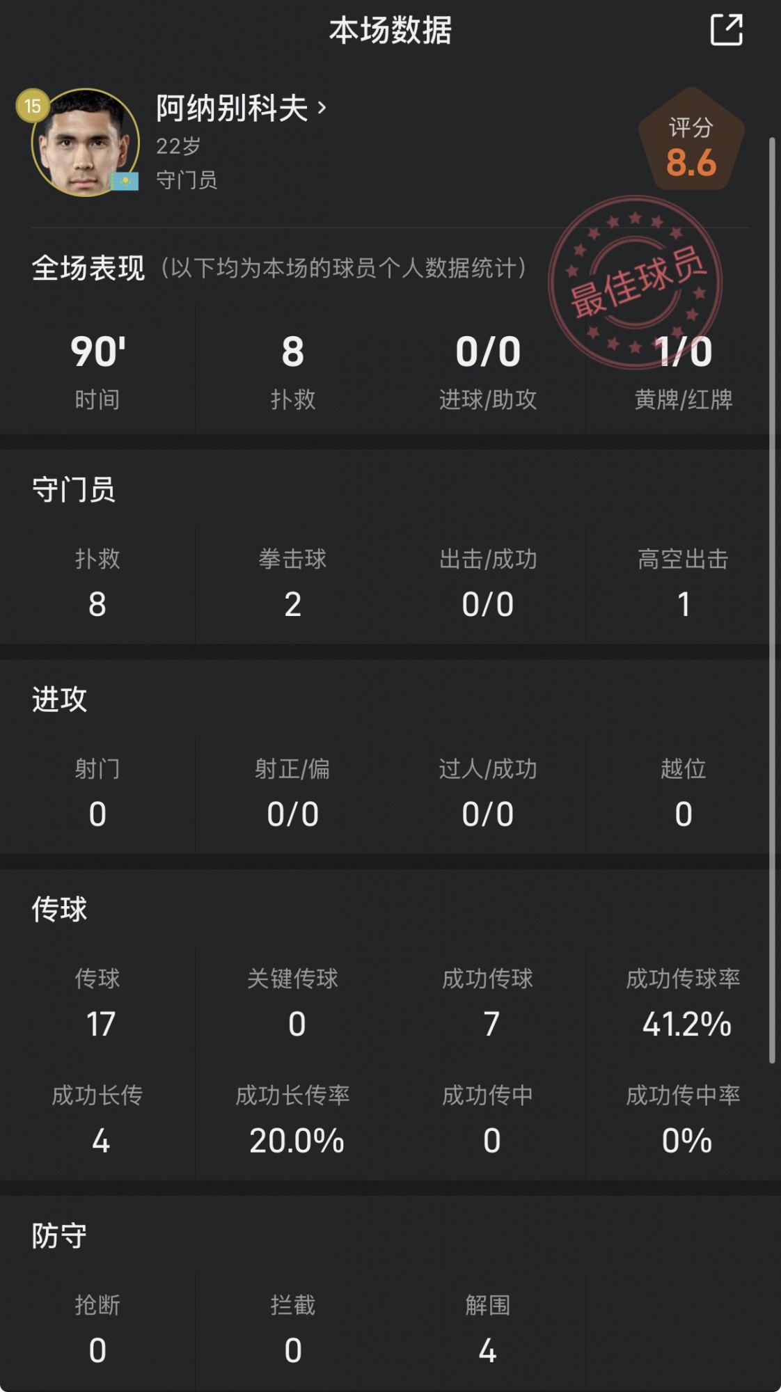 Statistiques du gardien de but du Kazakhstan contre la Belgique: a contribué à 8 arrêts + a extrêmement empêché ses coéquipiers de marquer contre son camp