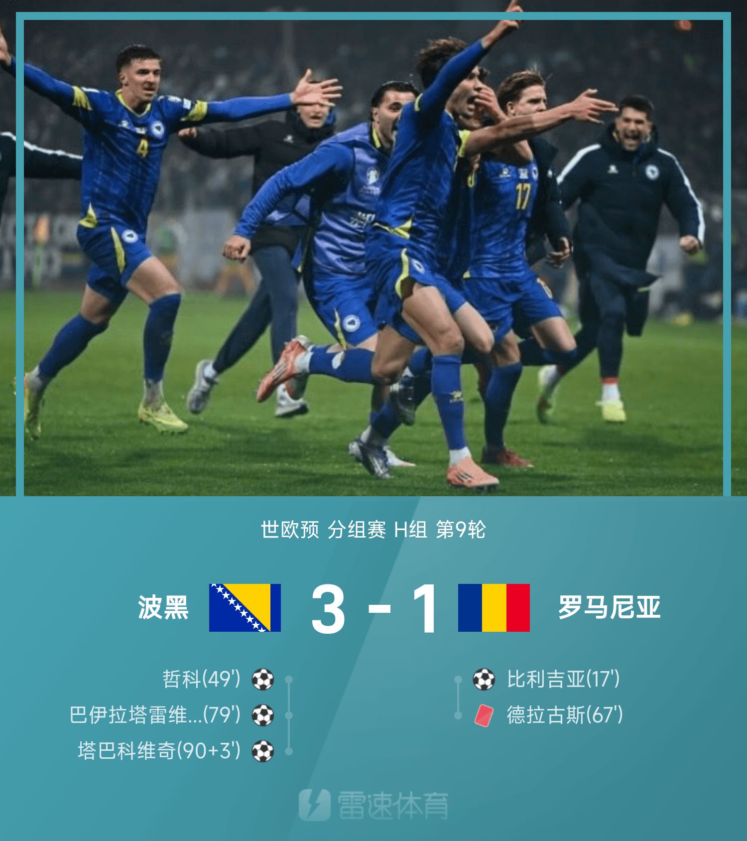 6686 Sports a rapporté le 16 novembre que lors du 9e tour du groupe H des 26e éliminatoires mondiaux européens, la Bosnie-Herzégovine avait affronté la Roumanie à domicile. En première mi-temps, la Roumanie a connu un début fantastique, avec un but de Villagia. En seconde période, la Bosnie-Herzégovine a commencé à exercer sa force et Dzeko a égalisé en brisant le gardien de but. Dragus a été expulsé pour grave infraction aux règles après deux minutes de jeu. Les dix hommes roumains affrontaient la Bosnie-Herzégovine. À la 79e minute, Bajlatarevich a marqué un but pour renverser la situation et Tabakovic a marqué pour sceller le match. Villagia n'a pas réussi à marquer le but et à sauver le sauveur. En fin de compte, la Bosnie-Herzégovine a battu la Roumanie, réduite à dix, 3-1.