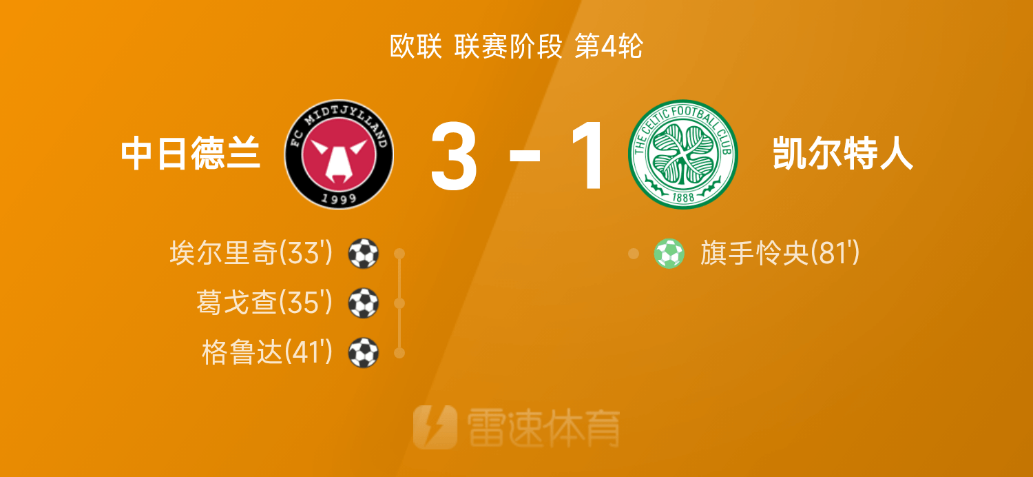 6686 Sports 07 novembre Au quatrième tour de la Ligue Europa 25/26, Midtjylland a battu le Celtic 3-1. Dans tout le match, Gegocha a joué un rôle exceptionnel et a contribué 1 tir et 1 passe. Gruda et Elrich ont marqué des buts, et le porte-drapeau Lianyang a marqué et n'a pas pu sauver le gardien de but.