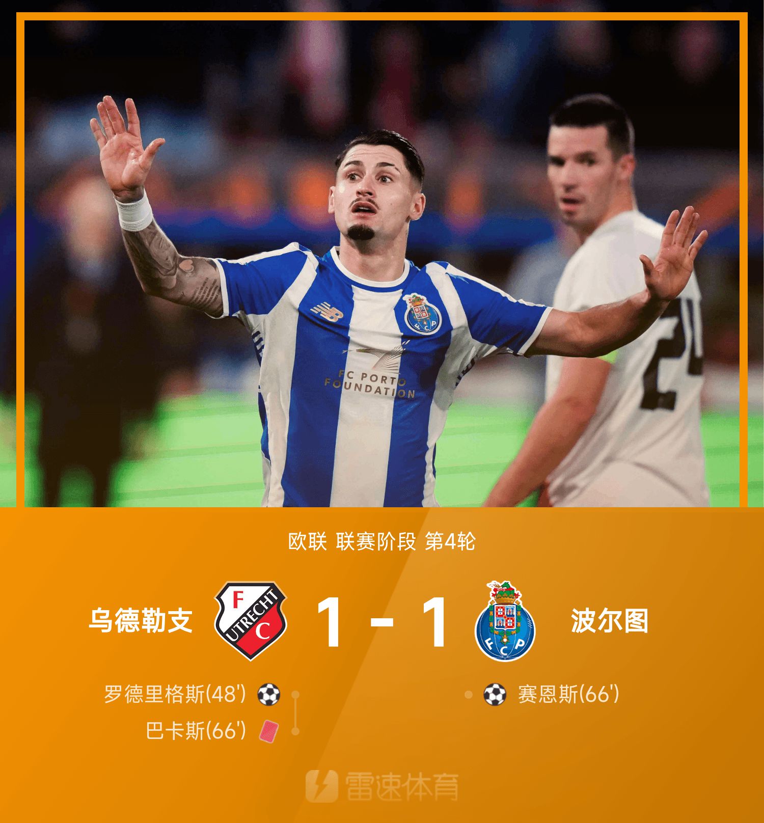 6686 Sports News le 7 novembre Au quatrième tour de la Ligue Europa 25/26, Utrecht a affronté Porto. En première mi-temps, aucune des deux équipes n’a rien obtenu. En seconde période, à la 48e minute, Rodriguez a contribué à sortir de l'impasse. Sainz a marqué un but dans un filet désert pour égaliser le score. Au cours de cette période, le gardien d'Utrecht Bakas s'est disputé avec un joueur de Porto et a été expulsé, et Utrecht a répondu avec dix hommes. Au final, Utrecht, réduit à dix, a fait match nul 1-1 contre Porto. Les deux équipes se sont serré la main et ont mis fin au match.