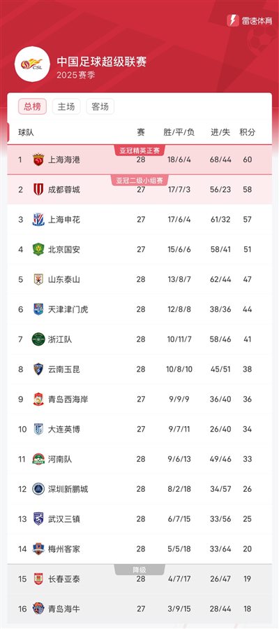 Haigang a mis fin à sa séquence de quatre victoires consécutives en championnat. Au dernier classement, l'équipe est toujours en tête de liste, mais n'a que 2 points d'avance sur Chengdu. Si Chengda bat la côte ouest de Qingdao ce soir, elle atteindra le sommet. Shenhua affrontera Dalian Yingbo ce soir, et l'équipe est temporairement classée troisième avec 57 points.
