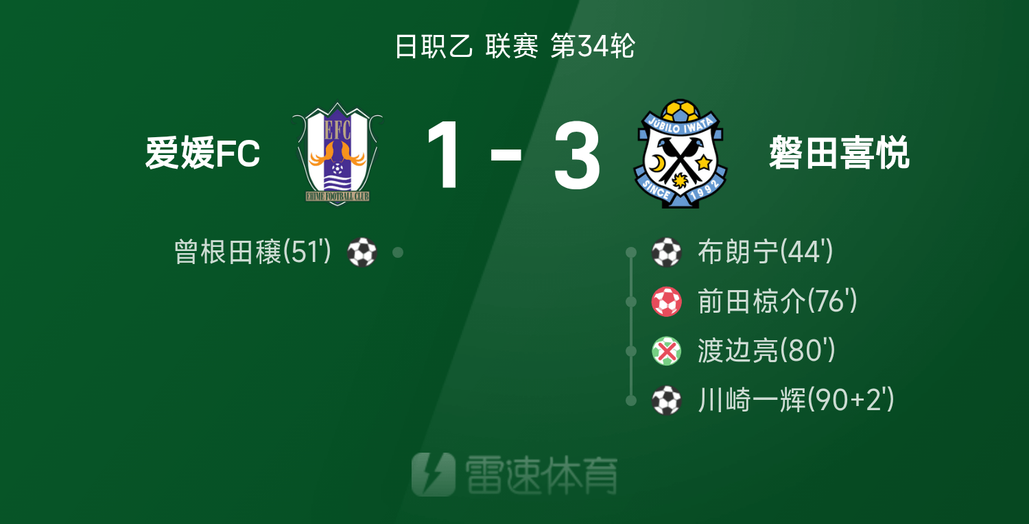 Rapport du match de la Ligue japonaise B: Maeda Fukusuke possède un but contre son camp, Watanabe Ryo manque un point, Ehime 1-3 Iwata Joy