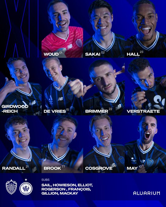 L'alignement de départ de l'Oakland FC: 1-Ward, 2-Hiroki Sakai, 15-De Vries, 23-Hall, 3-Girdwood-Reich, 22-Brimmer, 6-Fraster, 77-Brook, 21-Randall, 9-Cosgrove, 10-Mai