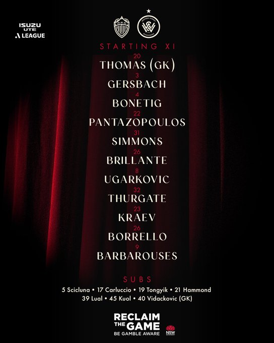 L'alignement de départ des Western Sydney Wanderers: 20-Thomas, 3-Gersbach, 4-Bonettigue, 31-Simmons, 22-Pantazopoulos, 25-Brillant, 8-Ugarkovic, 23-Klaye Husband, 32-Serget, 9-Barbaroses, 26-Borello