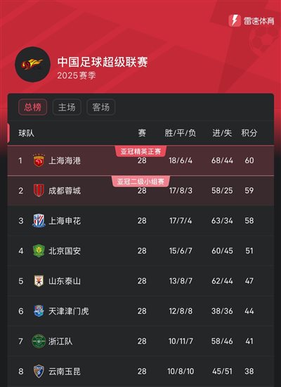6686 Sports News le 26 octobre La Super League chinoise a terminé aujourd'hui son 28e tour. Lors de ce tour, les quatre meilleures équipes de la Super League chinoise se sont toutes « renversées ». Haigang, Chengdu, Shenhua et Guoan n'ont pas réussi à gagner. À deux manches de la fin de la saison, il n'y avait que 2 points entre les trois premiers et Guoan s'est complètement retiré du championnat.