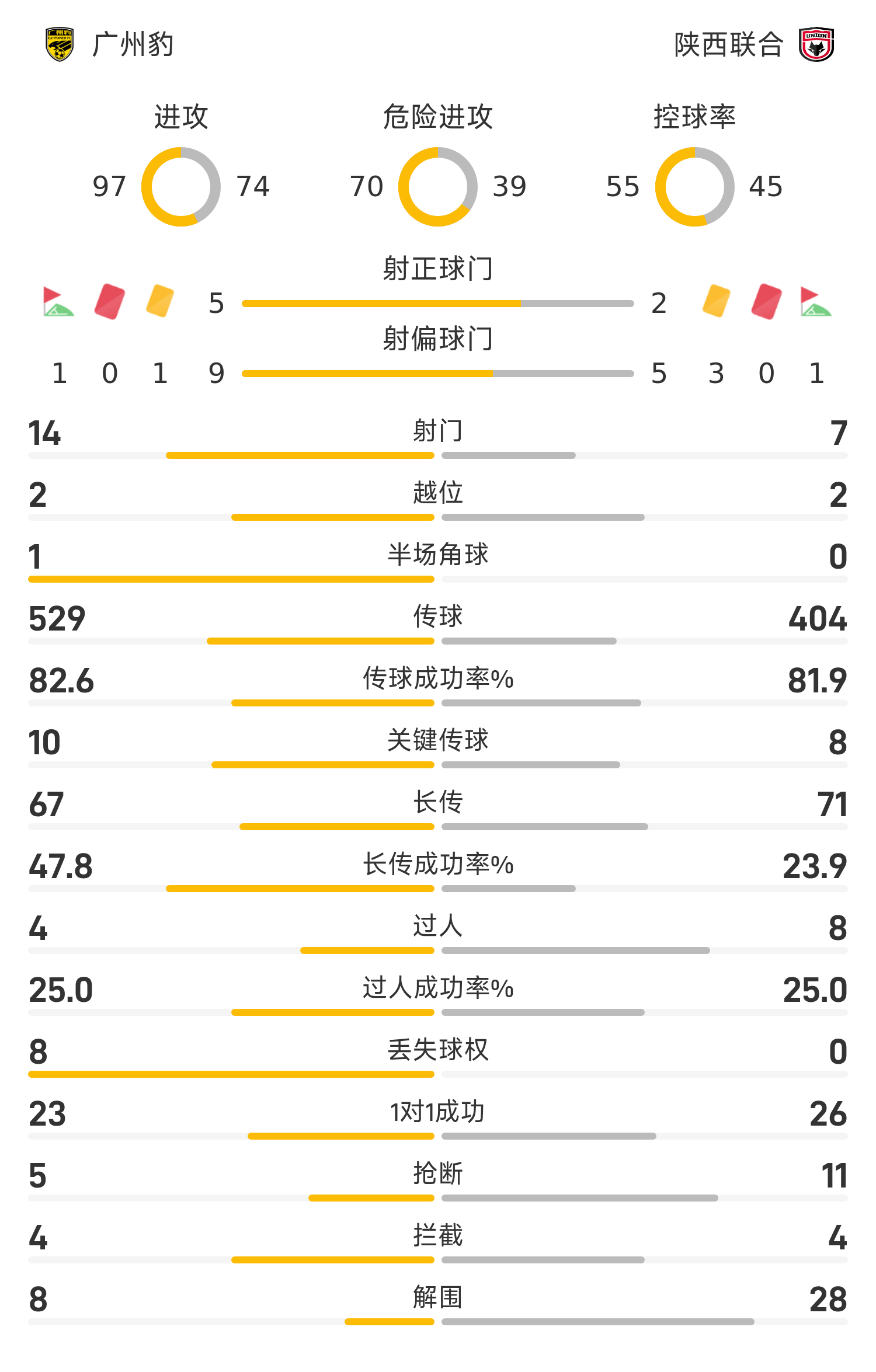 Liste de départ des Léopards de Guangzhou: 22-Xiao Jiaqi, 5-Jiang Jihong, 3-Han Xuan, 15-Deng Biao (81'42-Yang Hao), 37-Shang Yin (73'14-Zeng Chao), 25-Wang Jianming, 8-Cai Haochang (46'7-Carlos), 6-Duan Yunzi (90'1) 7-Yan Zihao), 11-Nikon, 20-Rosa, 9-Xia Dalong (73'10-Liang Xueming)