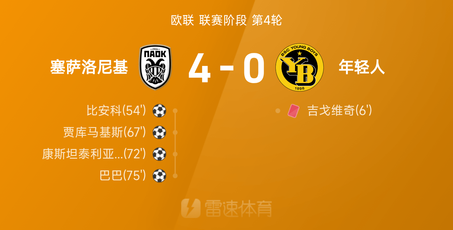 6686 Sports 07 novembre Au quatrième tour de la Ligue Europa 25/26, Thessalonique a battu les Young Boys 4-0. Pendant tout le match, Baba a joué de manière exceptionnelle et a contribué 1 tir et 1 passe. Constantillas, Jakumakis et Bianco ont marqué et Djigovic a marqué rouge.