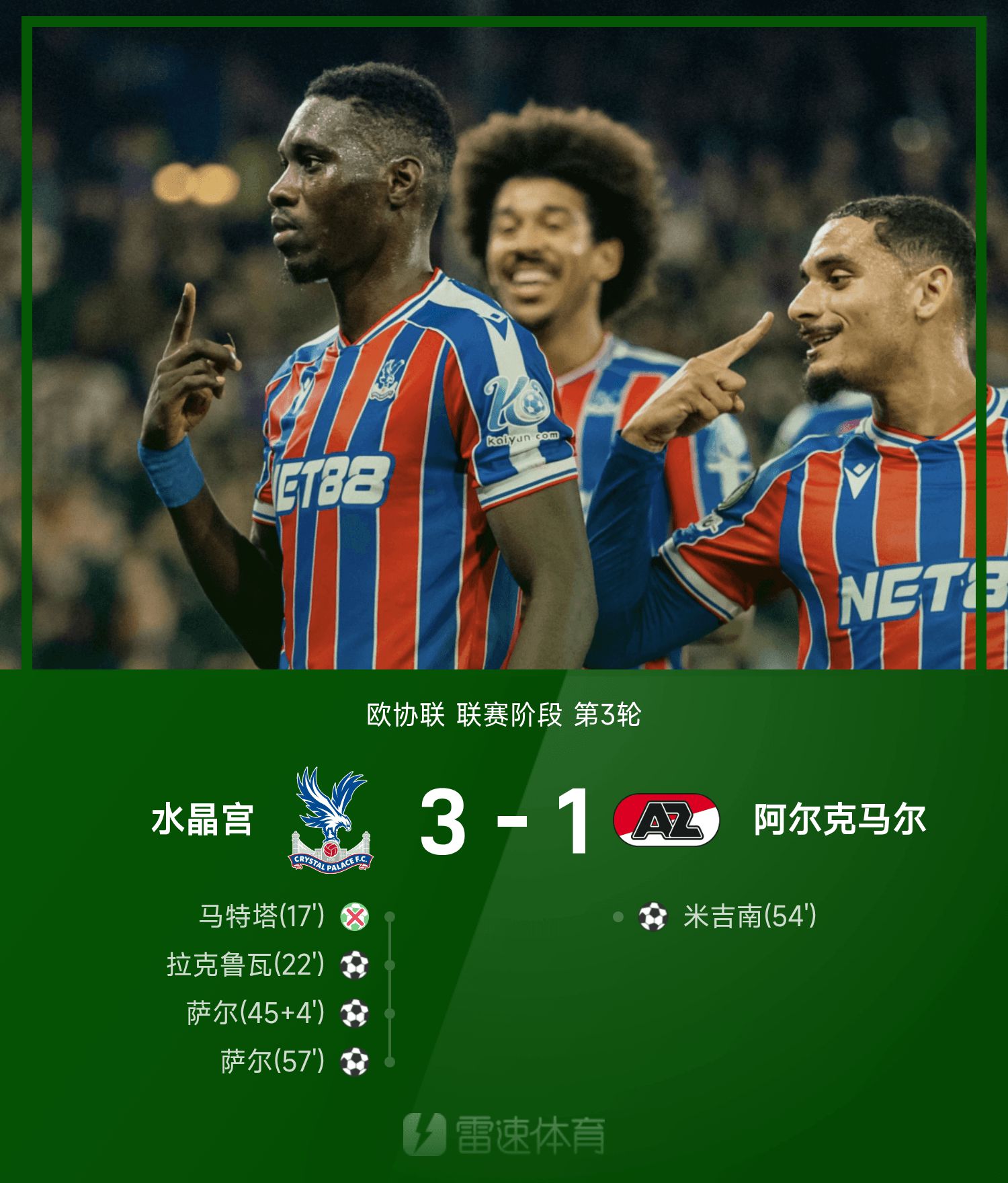6686 Sports News le 7 novembre Au troisième tour de l'UEFA Champions League 25/26, Crystal Palace a battu Alkmaar 3-1. Dans tout le match, Sarr a marqué deux fois, Lacroix a marqué un but, Miginan a marqué mais n'a pas réussi à sauver le gardien de but, Mateta a raté un point, Oduro a lui-même sauvé le point après avoir envoyé le point et a contribué 4 arrêts en un seul match.