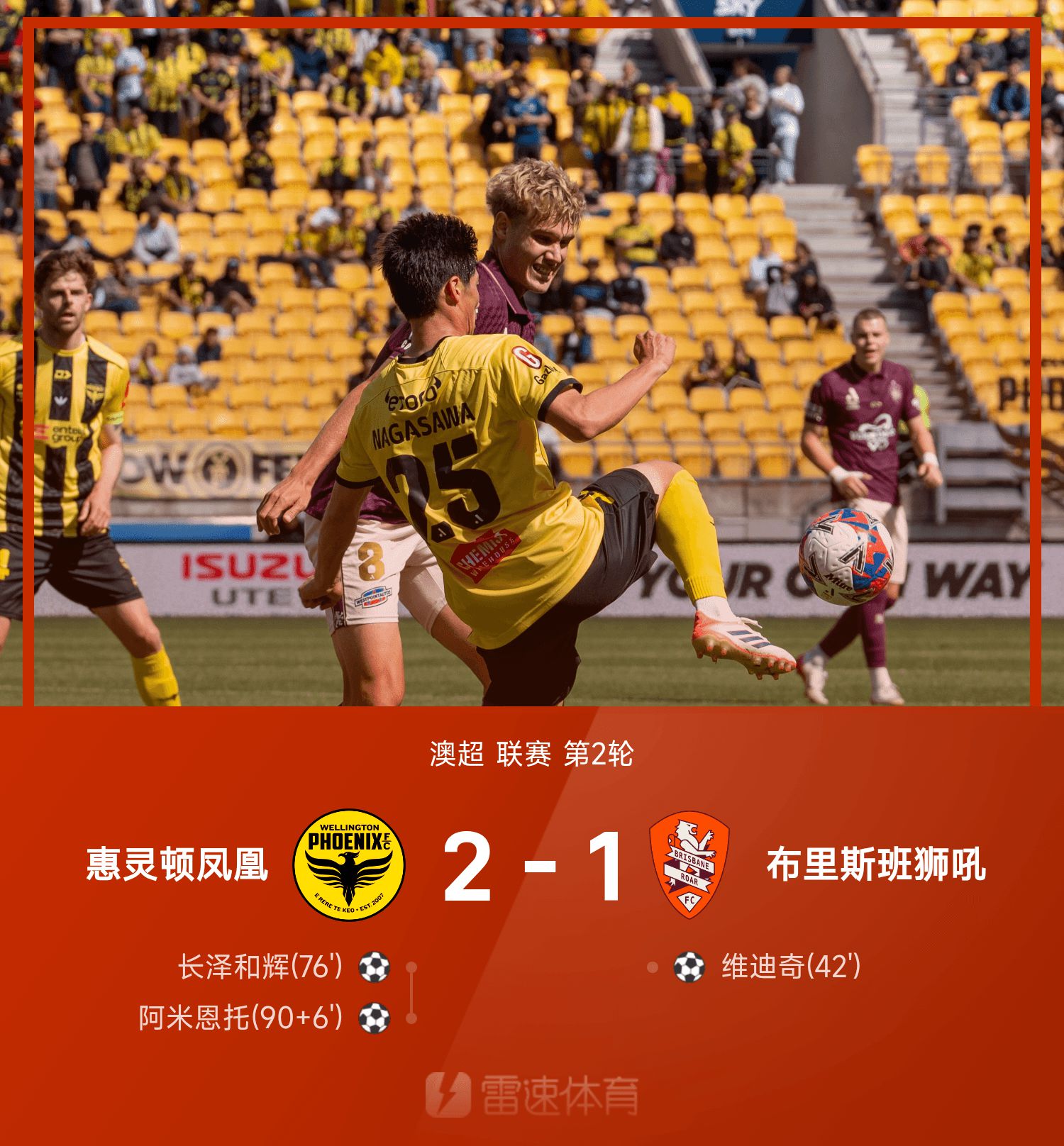 6686 Sports News le 26 octobre Au deuxième tour de la saison 25/26 de la A-League, Wellington Phoenix a battu Brisbane Roar 2-1. Dans la première moitié du match, Vidic a profité de la mauvaise opportunité de James pour marquer. En seconde période, Nagasawa Kazuki a marqué un but pour égaliser le score, et Armiento a tué son ancienne équipe avec le dernier tir dans les arrêts de jeu.
