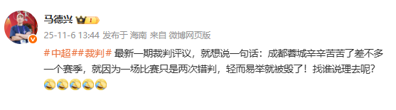 6686 Sports News le 6 novembre, le journaliste sportif Ma Dexing a déclaré sur les réseaux sociaux que la saison de travail acharné de Chengdu Chengdu avait été gâchée par deux erreurs de jugement.