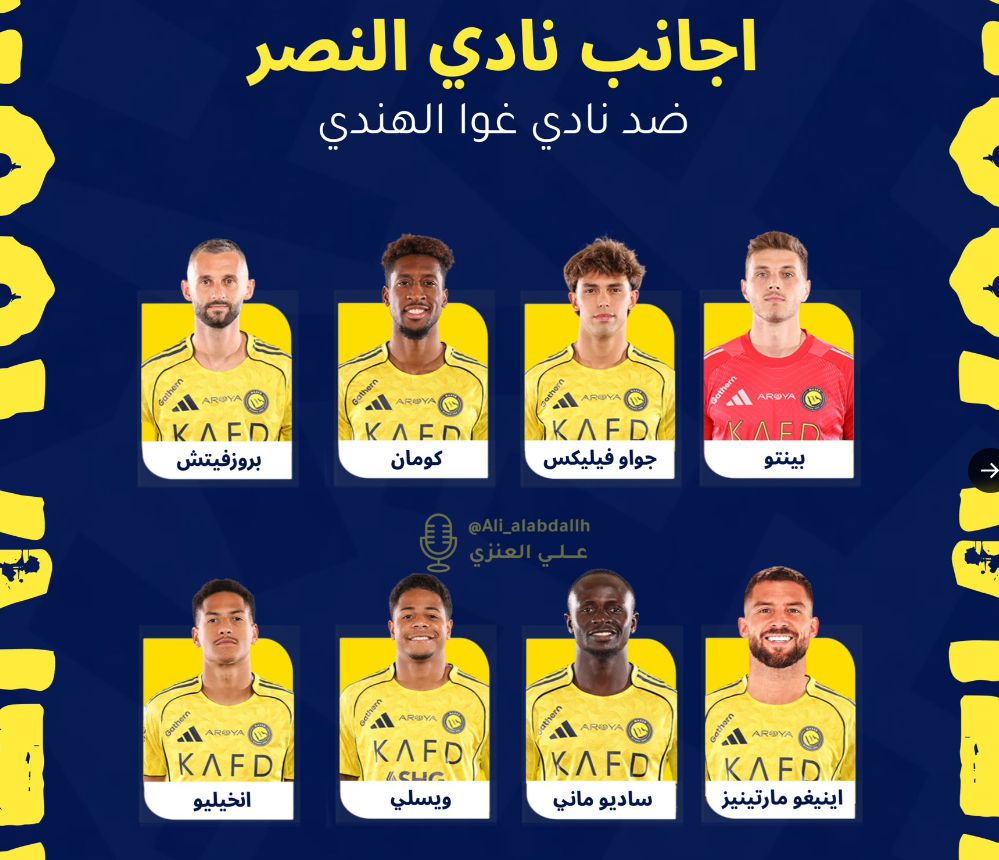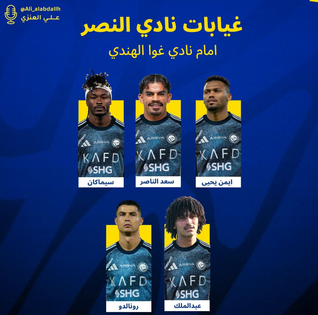 6686 Sports News le 6 novembre Selon un rapport du journaliste de l'équipe de Riyad alabdallh, 8 joueurs étrangers sont entrés dans la liste des compétitions de deuxième niveau de la Ligue des champions de l'AFC avec Goa, et Ronaldo, Simakan et d'autres sont absents.