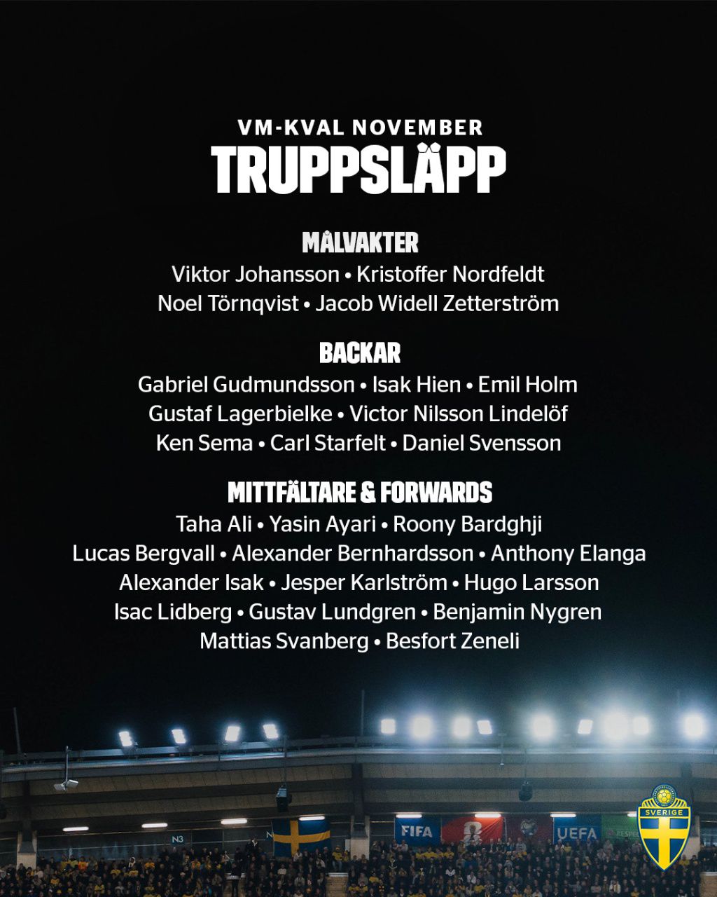 Milieu de terrain: Bejrivar (Tottenham), Yashin Ah Yari (Brighton), Hugo Larsson (Eintracht Francfort), Svanberg (Wolfsburg), Karlström (Udinese), Zenelli (Efsburg), Lundgren (Göteborg)