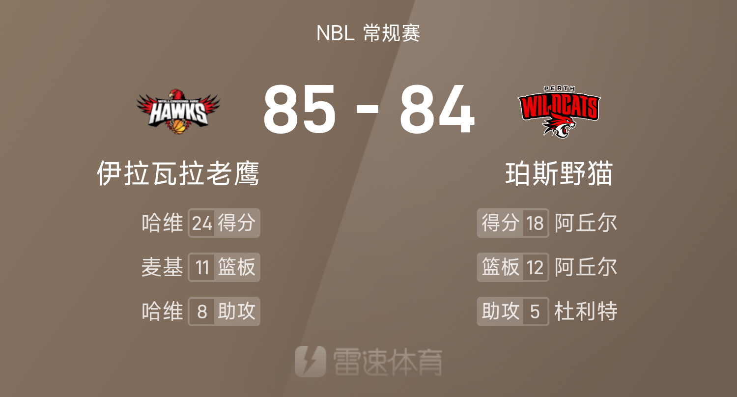 6686 Sports Actualités du 25 octobre Au cours de la saison régulière 25/26 de la NBL, les Wildcats de Perth ont affronté les Eagles d'Illawarra. En fin de match, les Wildcats de Perth s'inclinent face aux Eagles d'Illawarra 84-85. Harvey a marqué un record de 24 points, 5 rebonds et 8 passes décisives, menant les Illawarra Hawks à la victoire.
