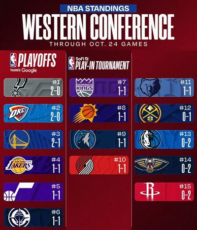 À l'heure actuelle, après les deux premiers matchs de la nouvelle saison, les Rockets, les Mavericks et les Pélicans sont tous difficiles à gagner et sont à égalité au dernier rang de la Conférence Ouest, tandis que les Spurs et le champion en titre Thunder mènent la Conférence Ouest avec un bilan de 2 victoires et 0 défaite.