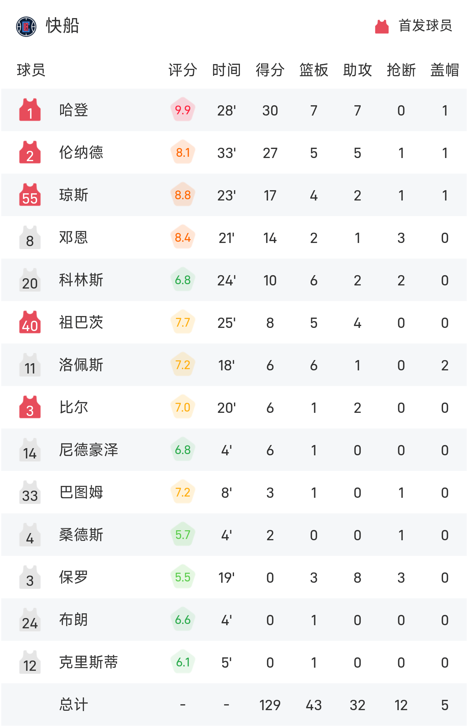 6686 Sports Actualités du 25 octobre Lors de la saison régulière 25/26 de la NBA, les Clippers ont affronté les Suns. En fin de match, les Clippers ont battu les Suns 129-102. Harden a marqué un record de 30 points, 7 rebonds et 7 passes décisives, menant les Clippers à la victoire.