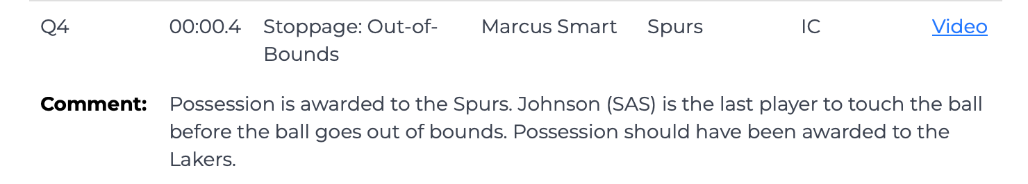 Dans les 0,4 dernières secondes, avant que le ballon ne sorte des limites, Keldon Johnson a été la dernière personne à toucher le ballon, mais l'arbitre a appelé Smart et le ballon est sorti des limites, et le ballon a été donné aux Spurs. C'était une décision incorrecte et le ballon aurait dû être attribué aux Lakers.