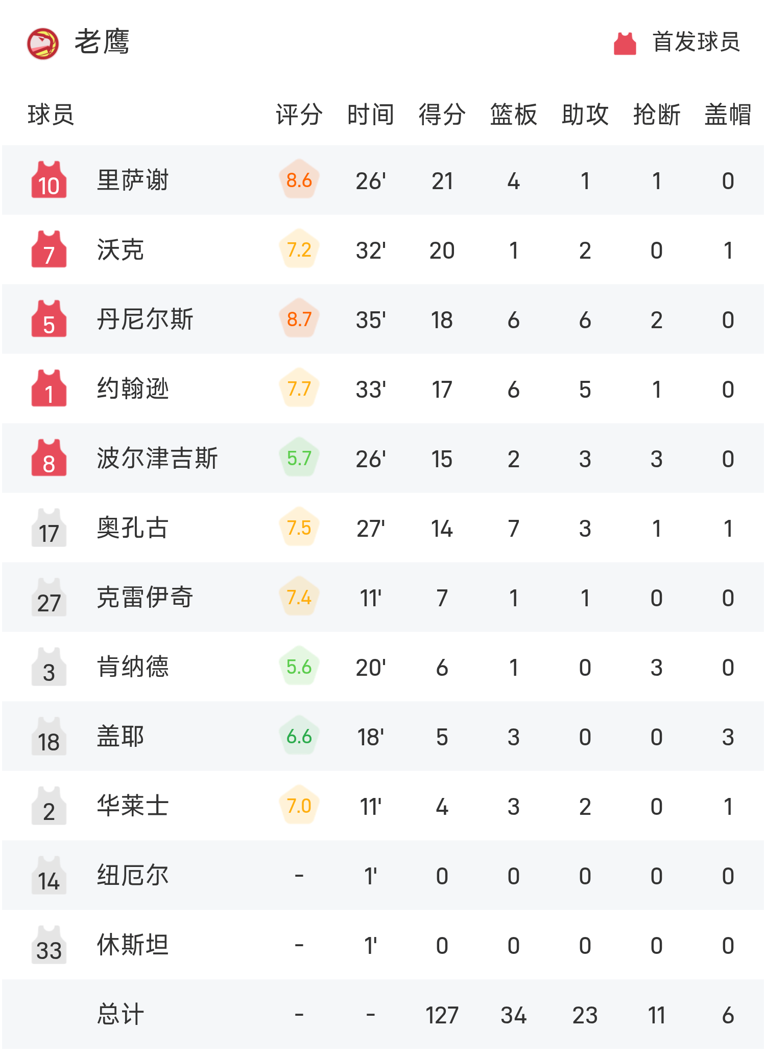 6686 Sports Actualités du 5 novembre Lors de la saison régulière 25/26 de la NBA, les Hawks ont joué contre le Magic. En fin de match, les Eagles ont battu le Magic 127-112. Risashe a marqué 21 points, 4 rebonds et 1 passe décisive pour mener l'équipe à la victoire, et Banqueiro a marqué un record de 22 points, 11 rebonds et 8 passes décisives.