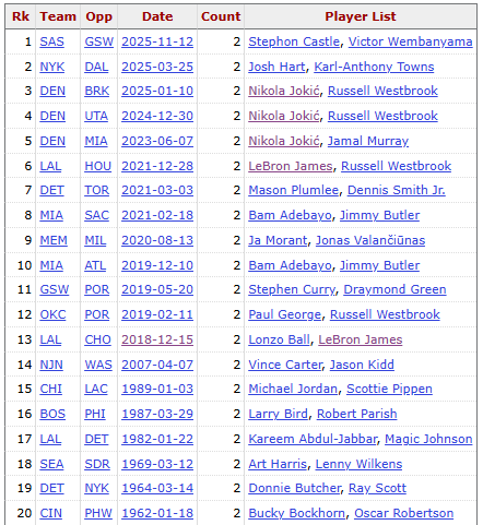 En incluant Bunyama et Castle aujourd'hui, il y a eu 20 miracles dans l'histoire de la NBA où des joueurs d'une même équipe ont réussi des triples doubles en même temps. Parmi eux, le roi triple-double Westbrook a participé au plus grand nombre de 4 fois, et Jokic a participé à 3 fois, se classant deuxième. Les deux ont marqué deux triples doubles sur le même terrain à deux reprises, et ils constituent la seule paire de l'histoire. James a été impliqué dans deux d'entre eux. À l'exception de trois personnes, aucun autre joueur ne peut le faire plus d'une fois.