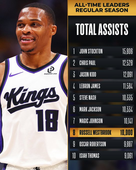 Actuellement, le joueur des Kings Westbrook a atteint 10 000 passes décisives au cours de sa carrière. Il est le huitième joueur de l'histoire de la NBA à atteindre cette statistique.