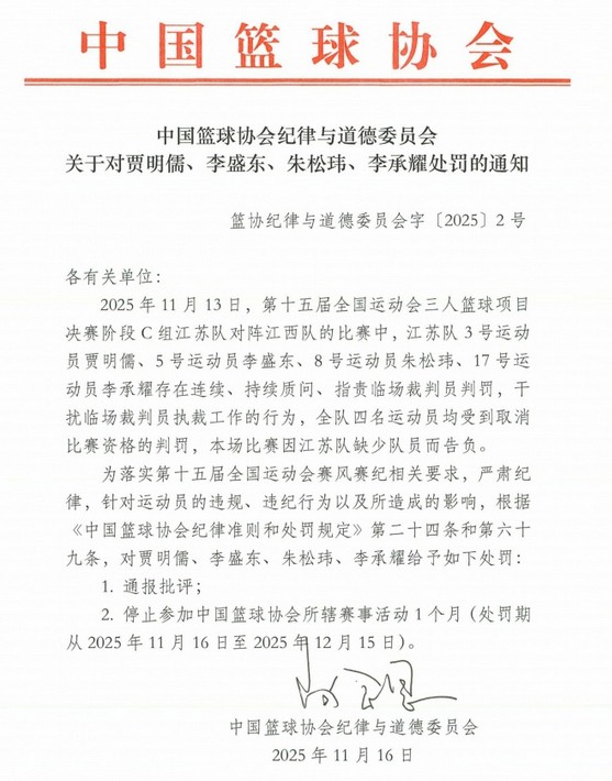 2. Suspension de la participation aux activités de compétition relevant de la juridiction de l'Association chinoise de basket-ball pendant 1 mois (la période de sanction est du 16 novembre 2025 au 15 décembre 2025).