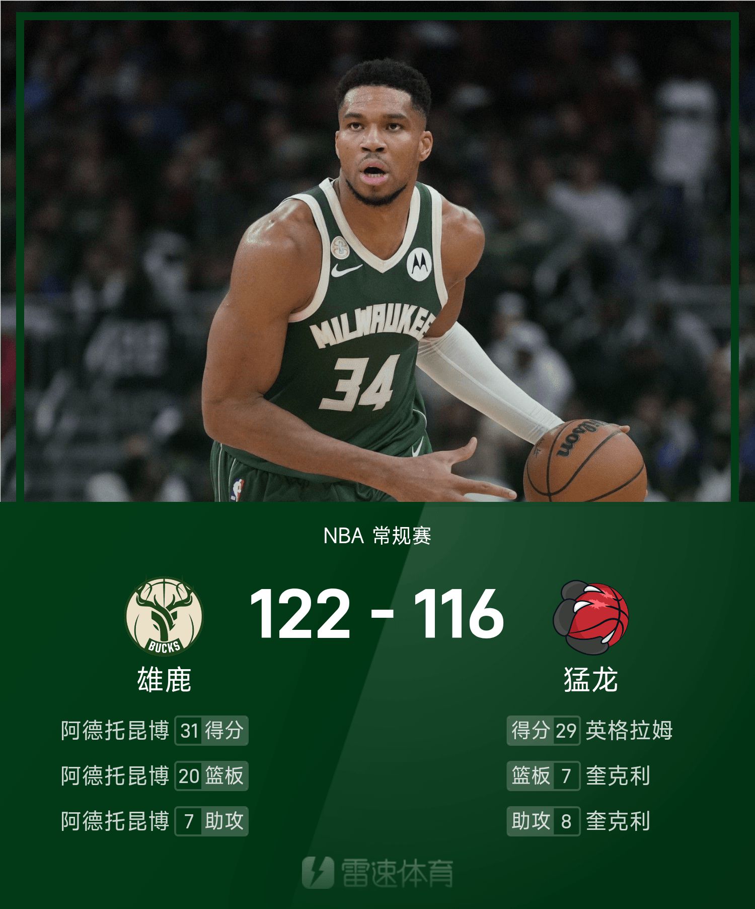 Rapport NBA : Antetokounmpo 31 points, 20 rebonds et 7 passes décisives, les Bucks battent les Raptors 122-116
