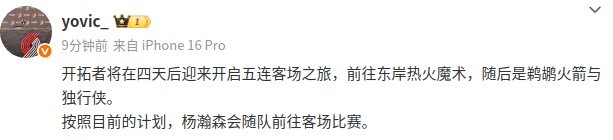 Blogueur : Les Trail Blazers inaugureront cinq matchs consécutifs à l'extérieur et Yang Hansen accompagnera l'équipe au match à l'extérieur.