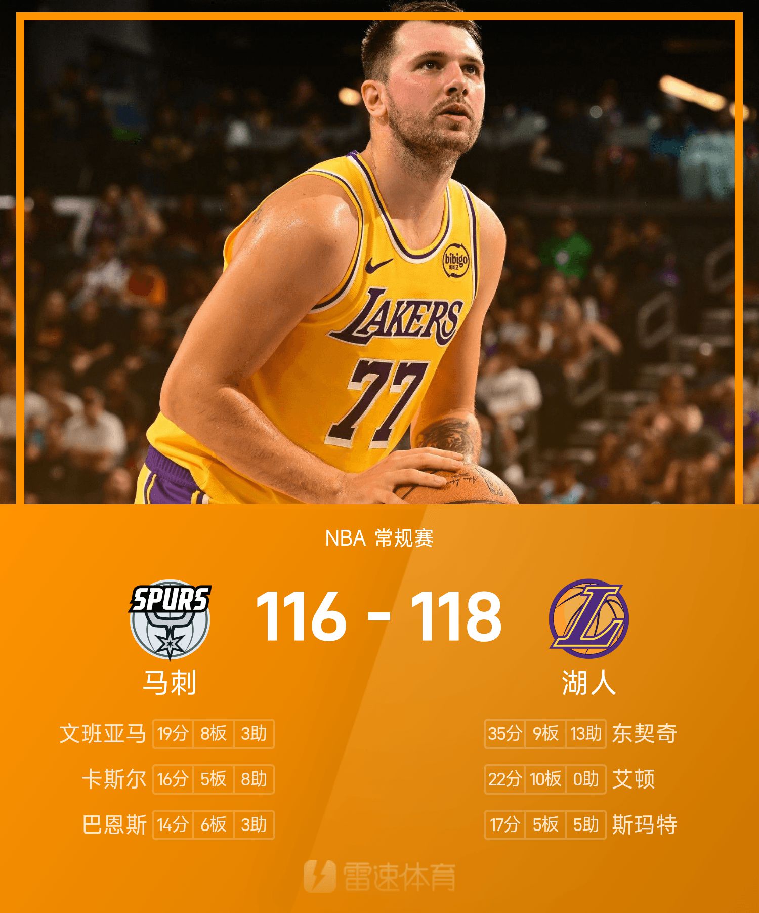 Rapport du match NBA : Doncic a récolté 35 points, 9 rebonds et 13 passes décisives, les Lakers ont battu de peu les Spurs 118-116
