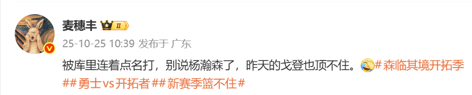 La personne médiatique @Mai Suifeng a écrit: "Étant battu par Curry par son nom, sans parler de Yang Hansen, Gordon n'a pas pu le supporter hier."