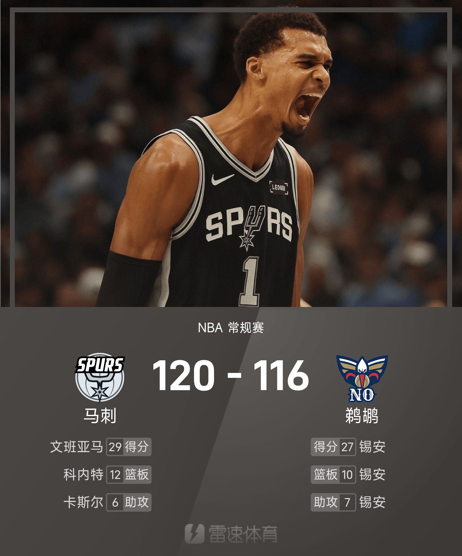 6686 Sports Actualités du 25 octobre Lors de la saison régulière 25/26 de la NBA, les Pélicans ont affronté les Spurs. En fin de match, les Pélicans s'inclinent face aux Spurs 116-120. Bunyama a marqué un record de 29 points, 11 rebonds et 2 passes décisives, menant les Spurs à la victoire.