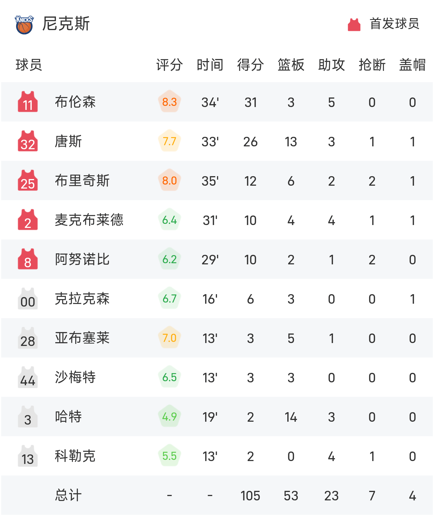 6686 Sports 25 octobre Lors de la saison régulière 25/26 de la NBA, les Knicks ont affronté les Celtics. En fin de match, les Knicks battent les Celtics 105-95. Brunson a marqué un record de 31 points, 3 rebonds et 5 passes décisives, menant les Knicks à la victoire.
