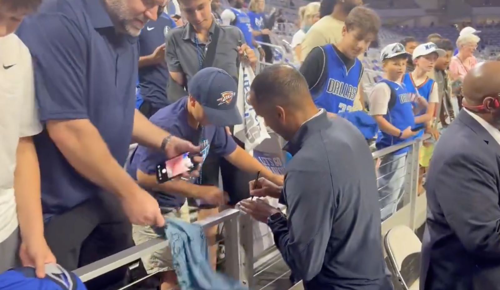 Harrison a signé des autographes et pris des photos pour les fans des Mavericks, sautant délibérément les fans portant l'uniforme de Doncic.